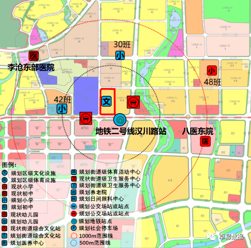 2. 教育与医疗: 周边现状有 34 中九年制学校 (距离约300米)、道口路幼儿园 (距离约400米),长征医院(距离约50米),规划周边有1处60班小学、1处30班小学、5处幼儿园,共计54班。