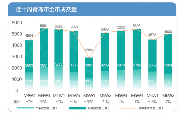 6月第2周,青岛楼市总成交4900套,环比上涨7%。其中,新房成交量3304套,环比上涨15.6%;新房住宅成交均价16628元/㎡,环比上涨9.8%。二手房成交量1596套,环比下降6.8%;二手房成交套均面积87.6㎡,环比下降0.2%。