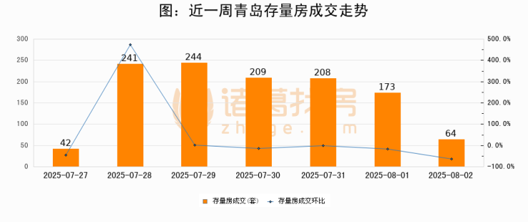 从存量房来看,2025年08月02日青岛存量房单日成交64套,比昨日减少109套,环比下降63%。从近一周存量房成交来看,青岛存量房日均成交套数为168套,08月02日单日成交64套,低于近一周平均水平61.9%。