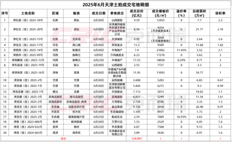 据克而瑞方面统计的数据,6月份天津市共计成交20宗经营性涉宅用地,成交总价约124.9亿元。