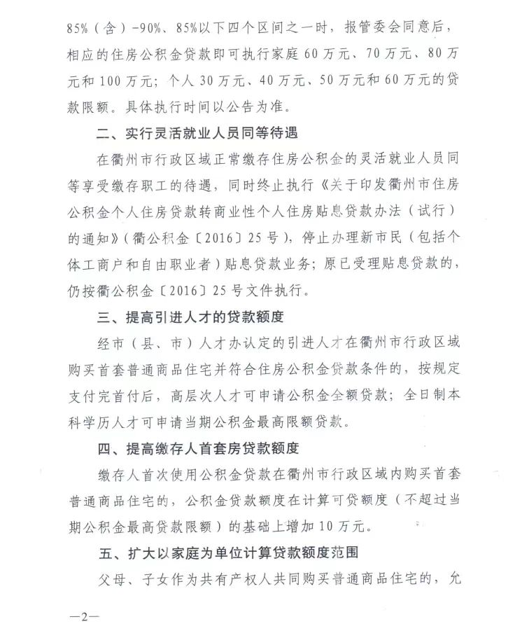 同时,《通知》显示,提高引进人才的贷款额度,经市(县、市)人才办认定的引进人才在衢州市行政区域购买首套普通商品住宅并符合住房公积金贷款条件的,按规定支付完首付后,高层次人才可申请公积金全额贷款;全日制本科学历人才可申请当期公积金较高限额贷款。