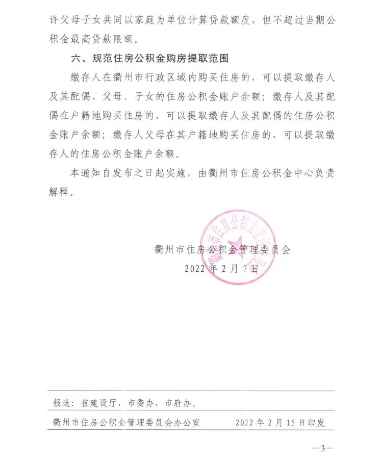 在规范住房公积金购房提取范围上,缴存人在衢州市行政区域内购买住房的,可以提取缴存人及其配偶、父母、子女的住房公积金账户余额;缴存人及其配偶在户籍地购买住房的,可以提取缴存人及其配偶的住房公积金账户余额;缴存人父母在其户籍地购买住房的,可以提取缴存人的住房公积金账户余额。