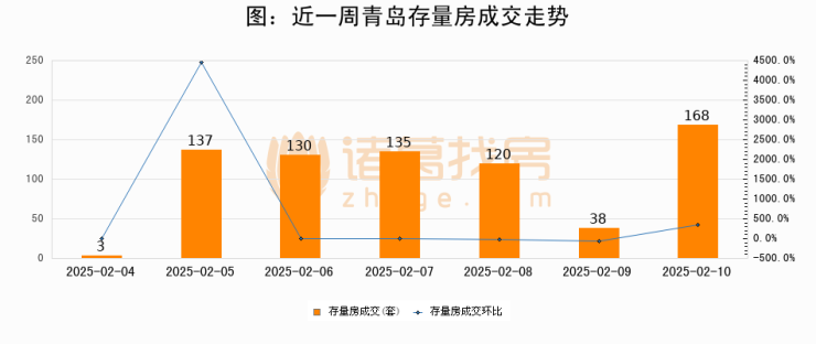 从存量房来看,2025年02月10日青岛存量房单日成交168套,比昨日增加130套,环比上涨342.1%。从近一周存量房成交来看,青岛存量房日均成交套数为104套,02月10日单日成交168套,高于近一周平均水平61.5%。