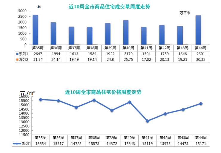 *新房市场:根据卓易数据统计,上周(10.25-10.31)青岛新建商品住宅成交2601套,环比上涨58.02%;成交面积为30.32万㎡,环比上涨57.83%。价格方面,上周青岛新建商品住宅均价为15171元/㎡,上涨698元/㎡,涨幅为4.82%。