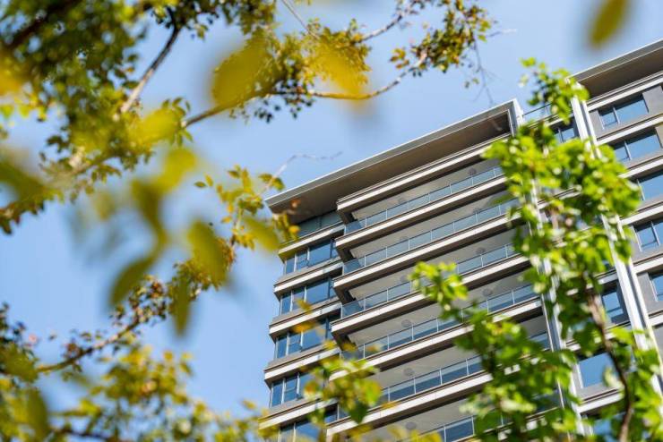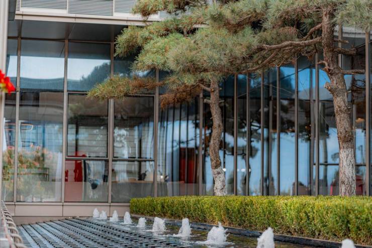 在园区环境营造上,青岛滨海国际中心·九著以超50%的绿化率为核芯,结合平均每100㎡1.25棵大乔木的浓密植被,构建出葱郁自然、浓荫庇护的静谧氛围。林木掩映间,光影会客区以艺术化的亚克力矩阵营造水光潋滟的视觉意境,成为邻里交流、休闲小憩的雅致场所。整体园区不仅绿意盎然,更在细节中融入人文关怀,实现自然与生活的和谐共融。