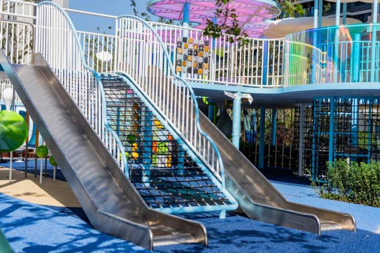 约1400㎡的云端全龄儿童乐园如今也已实景呈现,根据不同成长阶段需求,科学划分为1-3岁、3-6岁、6-12岁三大活动区域。园内不仅配备摇摇马、跳跳格、趣味攀爬墙、大型滑梯与互动地面游戏等多样化设施,更创新设置儿童研学区与超大艺术墙绘区,激发孩子的探索欲望与创造力。这片充满活力的乐园,已成为孩子们释放天性、家庭亲子互动、邻里社交的理想空间,为社区注入持续不断的生机与温度。