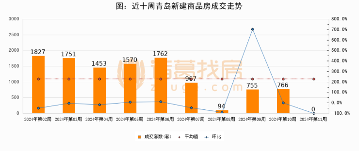 进入2024年第10周(03月04日-03月10日),青岛新建商品房成交0套,较上周减少766套,环比下降100%