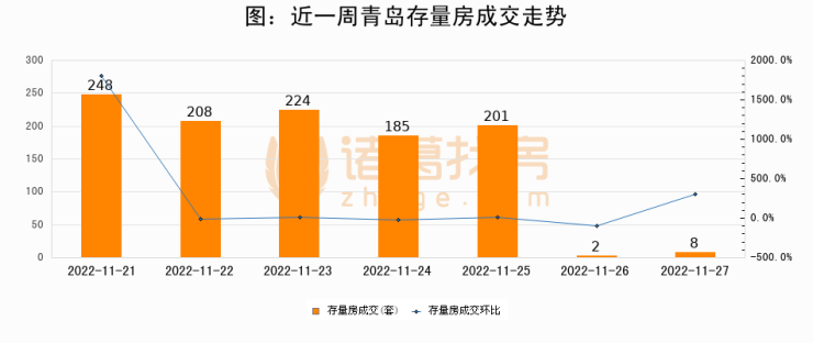 从存量房来看,2022年11月27日青岛存量房单日成交8套,比昨日增加6套,环比上涨300%。从近一周存量房成交来看,青岛存量房日均成交套数为153套,其中11月21日成交量最高为248套,11月27日单日成交8套,低于近一周平均水平94.8%。
