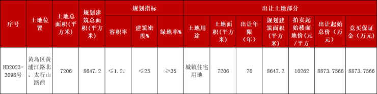 HD2023-3098号地块位于黄岛区黄浦江路北、太行山路西,占地面积7206㎡,容积率1.2,建筑面积8647.2㎡,建筑密度25%,绿地率35%,楼面起始地价10262元/㎡,起拍总价0.89亿,竞买保证金0.89亿。