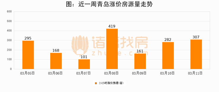 根据诸葛找房数据显示,青岛24小时涨价房源量为307套,较03月10日增加25套,环比上涨8.9%。与此同时,涨价房源占比小幅扩大,业主信心有所提升。
