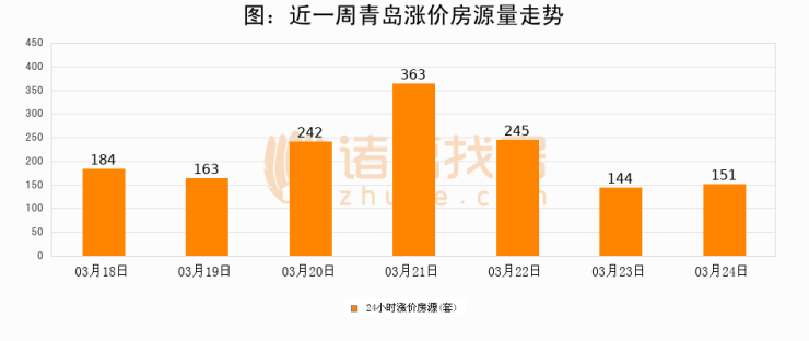 根据诸葛找房数据显示,青岛24小时涨价房源量为151套,较03月23日增加7套,环比上涨4.9%。与此同时,涨价房源占比小幅扩大,业主信心有所提升。