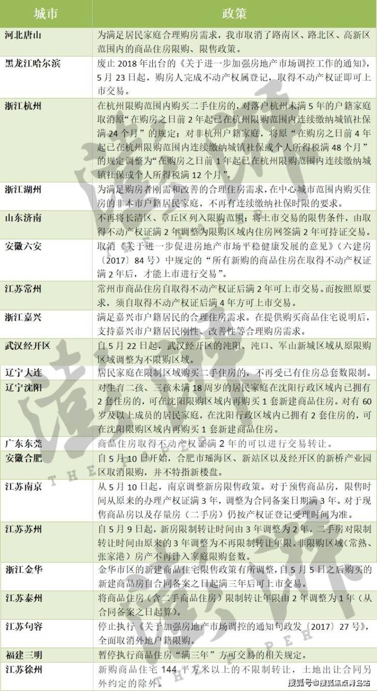 据澎湃新闻不完全统计,今年5月以来,包括河北唐山、黑龙江哈尔滨、浙江杭州、浙江湖州、山东济南、安徽六安、江苏常州、浙江嘉兴、武汉经开区、辽宁大连、辽宁沈阳、广东东莞、安徽合肥、江苏南京、江苏苏州、江苏泰州、江苏句容、浙江金华、福建三明、江苏徐州等20余城出台楼市新政,直指放开或调整限购及限售政策。以黑龙江哈尔滨为例,5月23日,哈尔滨市人民政府发布通知,宣布废止2018年出台的《关于进一步加强房地产市场调控工作的通知》。通知指出,2018年印发的通知已完成阶段性调控使命,继续实施区域性限售将导致一部分购房者购买的商品房无法上市交易,抑制了改善性购房需求的释放,不利于哈尔滨市房地产市场发展的需要,因此予以废止。即日起,购房人完成不动产权属登记,取得不动产权证即可上市交易。