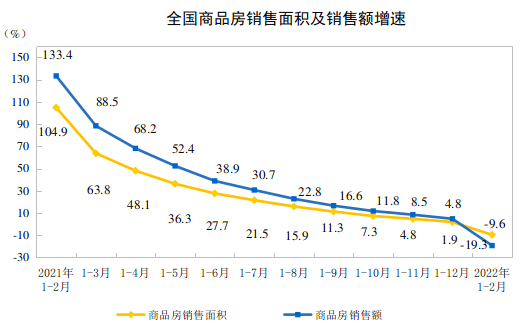 今年前2个月,在市场基本面仍然偏冷的情况下,商品房销售有较大幅度的下滑。根据国家统计局数据,1-2月份,商品房销售面积约1.57亿平方米,同比下降9.6%,其中住宅销售面积下降13.8%;商品房销售额约1.55万亿元,下降19.3%,其中住宅销售额下降22.1%。