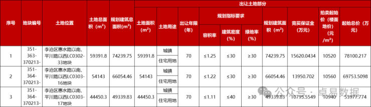 3宗地占地157985.1㎡,总建面18.96万㎡,总价20.18亿,3宗地最低容积率1.11,3宗地中楼面地价中最低10520元/㎡,最高10940元/㎡。
