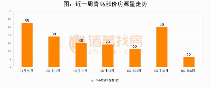 根据诸葛找房数据显示,青岛24小时涨价房源量为12套,较05月05日减少38套,环比下降76%。与此同时,涨价房源占比小幅回落,对于购房者来说是一个入市窗口期,购房者可抓住时机入市。