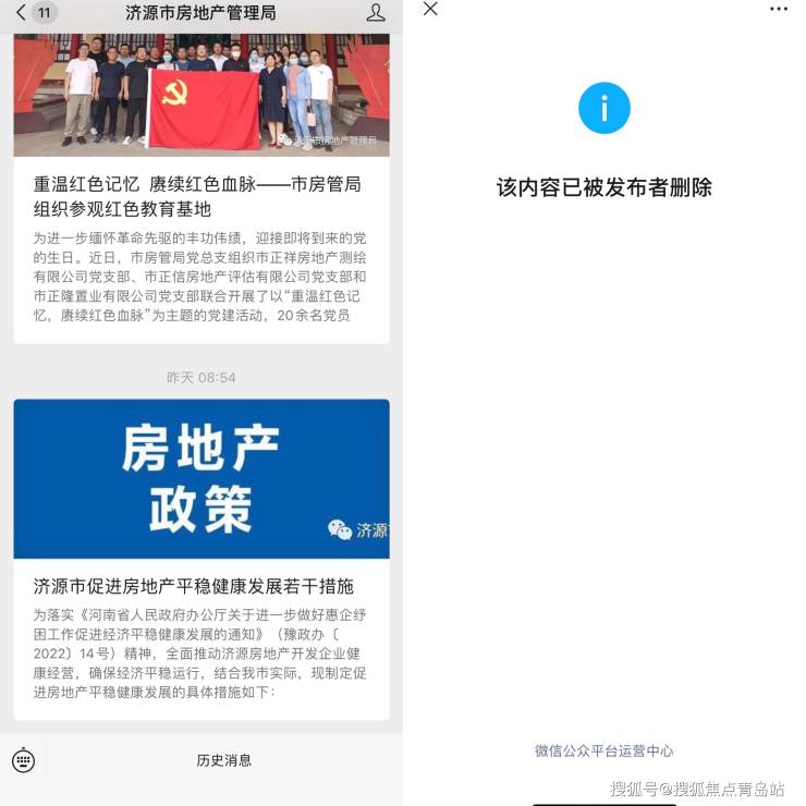 不过,6月30日,澎湃新闻再次打开济源市房地产管理局官方微信号发现,上述政策已显示“该内容已被发布者删除”。对此,澎湃新闻致电咨询济源市房地产管理局,对于政策为何显示删除以及后续是否会出台新政,其内部工作人员均表示:“不清楚”。