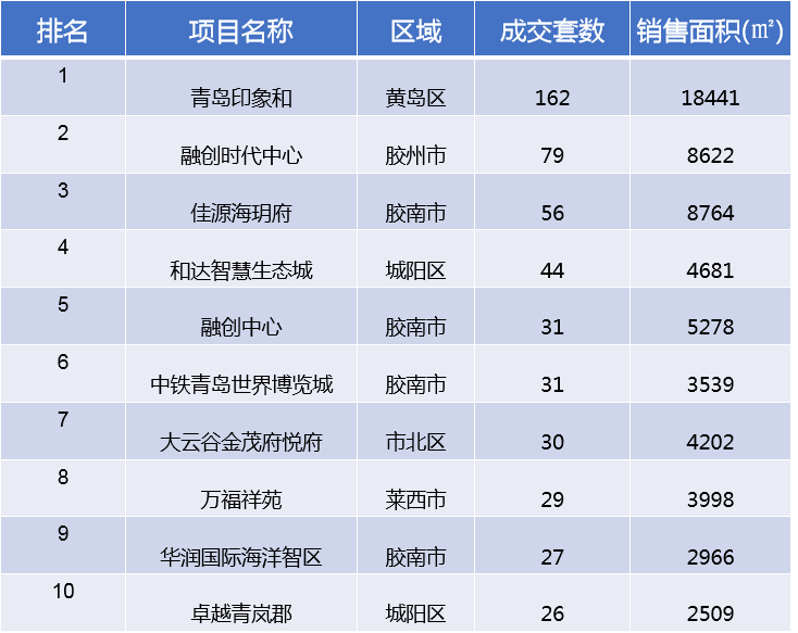 排在第四到第十位的分别是和达智慧生态城、融创中心、中铁青岛世界博览城、大云谷金茂府悦府、万福祥苑、华润国际海洋智区、先进青岚郡。从各区及各项目的成交情况来看,上周新建商品住宅成交以近郊各区项目为主,主城区仅大云谷金茂府1个项目上榜。