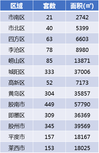 从各区成交情况来看,上周原胶南市新建商品住宅成交449套,成交面积为57790㎡,位列上周各片区新建商品住宅成交面积和成交套数首位;胶州市以成交345套,成交面积39569㎡的成绩名列第二;城阳区以单周成交333套,成交面积37006㎡列第三位。