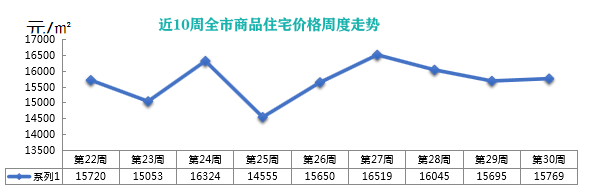 价格方面,上周青岛新建商品住宅均价为15769元/㎡,上涨75元/㎡,涨幅为0.47%。