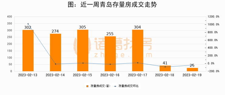 从存量房来看,2023年02月19日青岛存量房单日成交25套,比昨日减少16套,环比下降39%。从近一周存量房成交来看,青岛存量房日均成交套数为215套,其中02月15日成交量最高为305套,02月19日单日成交25套,低于近一周平均水平88.4%。