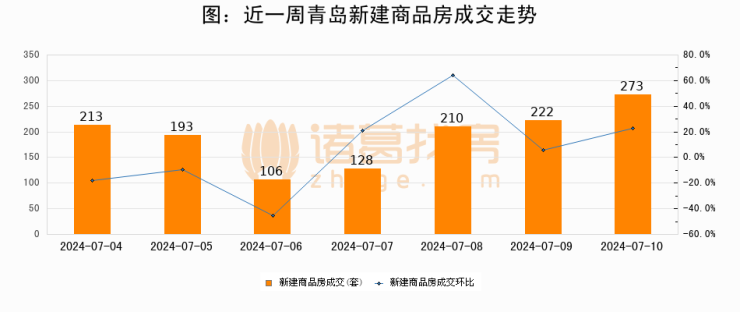 根据青岛市住房和城乡建设局数据显示,2024年07月10日青岛新建商品房成交273套,较昨日增加51套,环比上涨23%