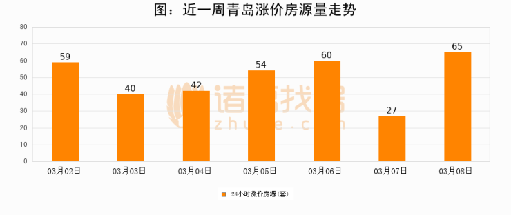 根据诸葛找房数据显示,青岛24小时涨价房源量为65套,较03月07日增加38套,环比上涨140.7%。与此同时,涨价房源占比小幅扩大,业主信心有所提升。
