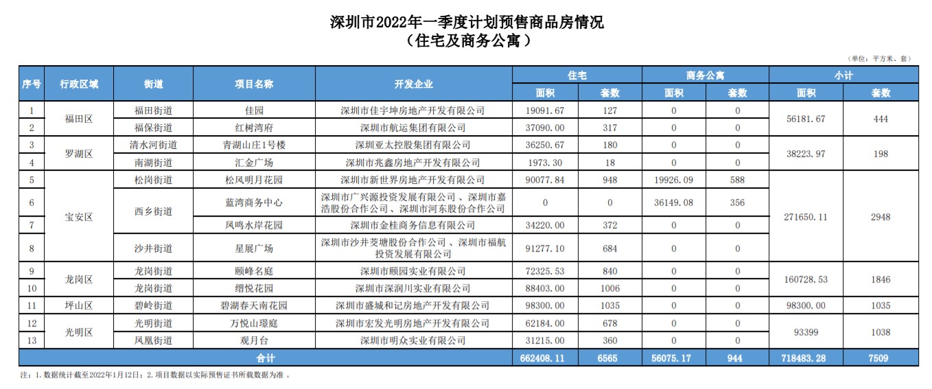 1月12日,深圳市住房和建设局发布《关于我市2022年一季度商品住宅和商务公寓房源信息情况的公示》,截至2022年1月12日,深圳市2022年一季度计划入市的商品住宅及商务公寓项目13个,预计供应房源面积为71.85万平方米,共7509套,其中:住宅66.24万平方米,6565套;商务公寓5.61万平方米,944套。