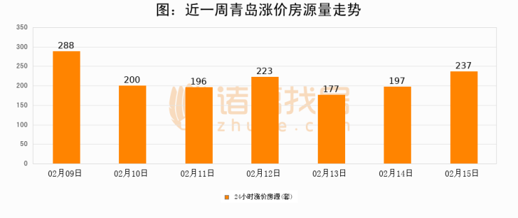 根据诸葛找房数据显示,青岛24小时涨价房源量为237套,较02月14日增加40套,环比上涨20.3%。与此同时,涨价房源占比小幅扩大,业主信心有所提升。