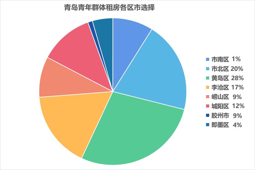 黄岛区凭借租金较低,房屋装修较新,居住条件好等优势,获得28%租房青年人的青睐。市北区、李沧区租金水平和通勤距离相对均衡,也成为不少青年人的选择。