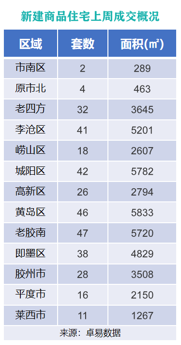 从各区成交情况来看,上周原黄岛区新建商品住宅以成交面积5833㎡的成绩,位列上周各片区新建商品住宅成交面积榜首位;城阳区以成交面积5782㎡的成绩,位列成交面积榜第二位;原胶南市以成交面积5720㎡的成绩,位列成交面积榜第三位。