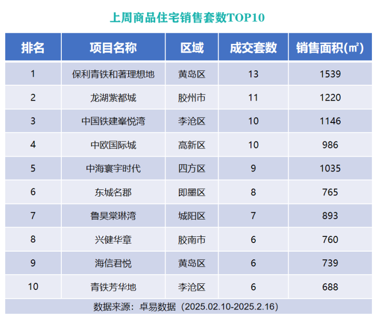 从各项目成交套数来看,位于西海岸新区的保利青铁和著理想地以成交13套的成绩列榜单首位;位于胶州市的龙湖紫都城以成交11成绩上榜第二位;位于李沧区的中国铁建峯悦湾以成交10套的成绩列榜单第三位。