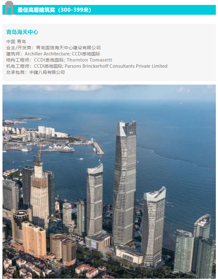 日前,青岛海天中心斩获“2022年CTBUH全球奖较佳高层建筑杰出奖(300-399米)”!并将于2022年高层建筑+都市人居先锋会议全球大会中冲击以上类别的较高奖项“全球奖”及“人气奖”等多项成就。