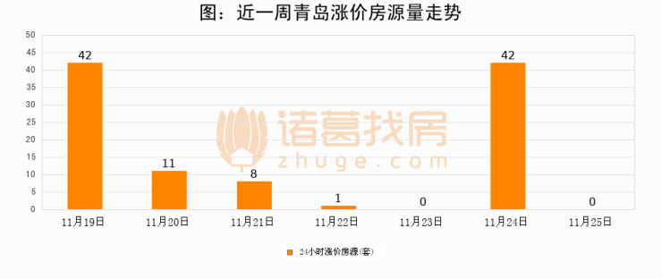 根据诸葛找房数据显示,青岛24小时涨价房源量为0套,较11月24日减少42套,环比下降100%。与此同时,涨价房源占比小幅回落,对于购房者来说是一个入市窗口期,购房者可抓住时机入市。