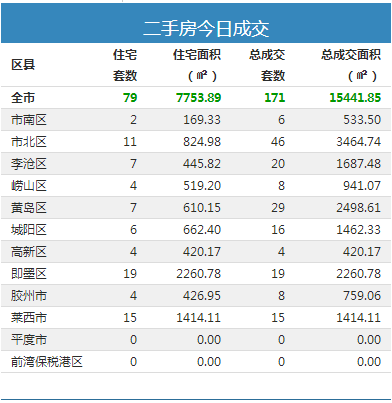 24日全市二手房成交171套,总成交面积15441.85㎡,包括住宅79套,成交面积7753.89㎡。(图为各区市住宅交易量数据)