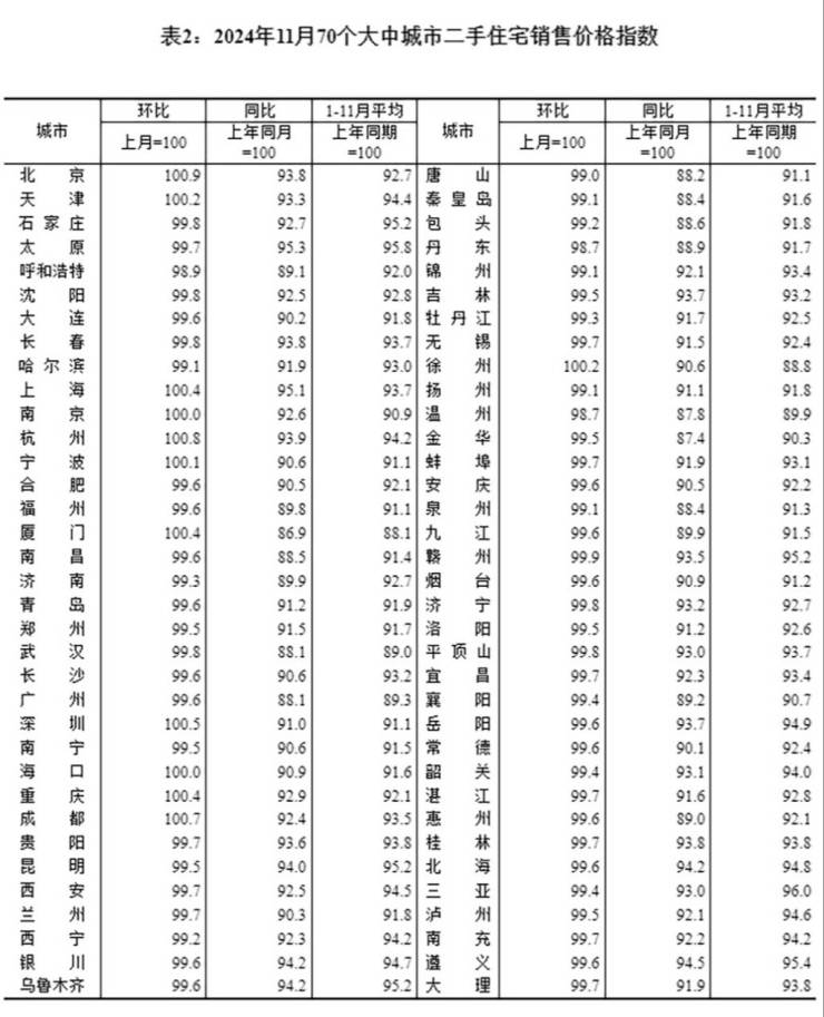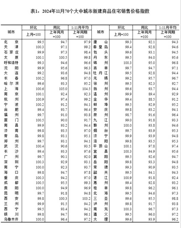 12月16日,国家统计局发布2024年11月份70个大中城市商品住宅销售价格变动情况。