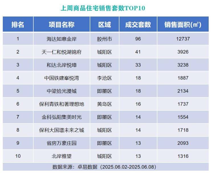 从各项目成交套数来看,位于胶州市的海达如意金岸以成交96套的成绩列榜单首位;位于城阳区的天一仁和悦湖锦府以成交41套的成绩上榜第二位。