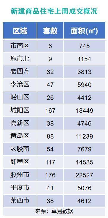 从各区成交情况来看,上周胶州市新建商品住宅以成交面积22527㎡的成绩,位列上周各片区新建商品住宅成交面积榜首位;城阳区以成交面积18449㎡的成绩,位列成交面积榜第二位;即墨区以成交面积14535㎡的成绩,位列成交面积榜第三位。