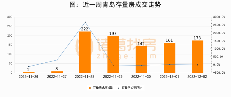 从存量房来看,2022年12月02日青岛存量房单日成交173套,比昨日增加12套,环比上涨7.4%。从近一周存量房成交来看,青岛存量房日均成交套数为129套,其中11月28日成交量最高为222套,12月02日单日成交173套,高于近一周平均水平34.1%。