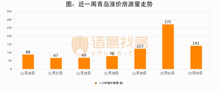根据诸葛找房数据显示,青岛24小时涨价房源量为141套,较12月01日减少131套,环比下降48.2%。与此同时,涨价房源占比小幅回落,对于购房者来说是一个入市窗口期,购房者可抓住时机入市。