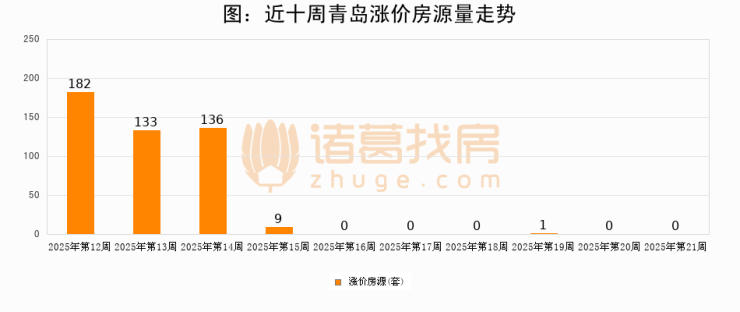 从调价房源来看,第21周青岛涨价房源0套,较上周持平。与此同时,21周涨价房源占比持平