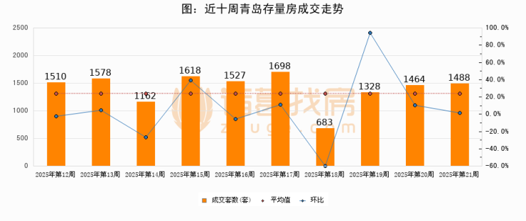 存量房方面,第21周青岛存量房成交1488套,较上周增加24套,环比上涨1.6%。从近十周成交走势来看,周均成交套数为1405套,本周高于平均水平5.9%。