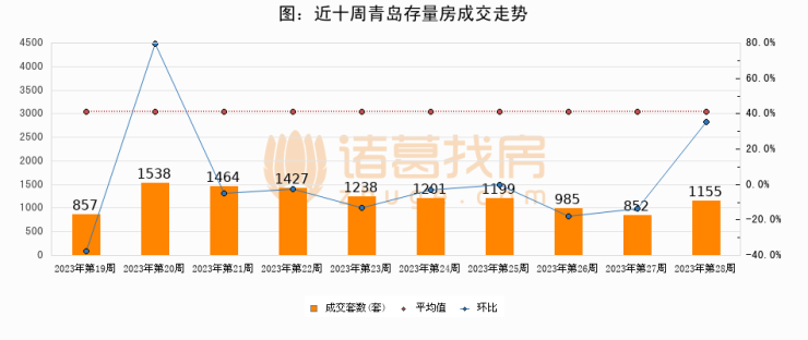 存量房方面,第28周青岛存量房成交1155套,较上周增加303套,环比上涨35.6%。从近十周成交走势来看,周均成交套数为1191套,本周低于平均水平3%。