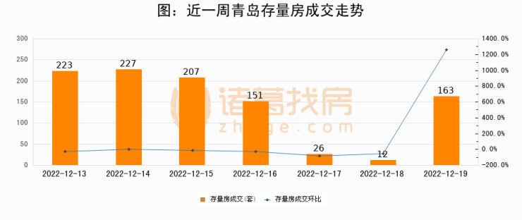 从存量房来看,2022年12月19日青岛存量房单日成交163套,比昨日增加151套,环比上涨1258.3%。从近一周存量房成交来看,青岛存量房日均成交套数为144套,其中12月14日成交量最高为227套,12月19日单日成交163套,高于近一周平均水平13.2%。