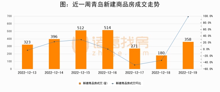 根据青岛市住房和城乡建设局数据显示,2022年12月19日青岛新建商品房成交358套,较昨日增加178套,环比上涨98.9%