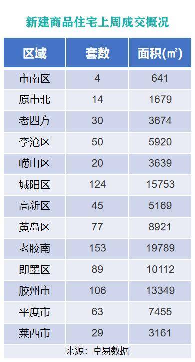 从各区成交情况来看,上周原胶南市新建商品住宅以成交153套,成交面积19789㎡的成绩,位列上周各片区新建商品住宅成交面积和成交套数榜首位;城阳区以成交124套,成交面积15753㎡的成绩,位列成交面积榜第二位;胶州市以成交106套,成交面积13349㎡的成绩,位列成交面积榜第三位。