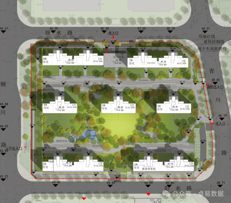 项目规划7栋17层住宅,中心形成景观花园,南侧沿街布置邻里坊。