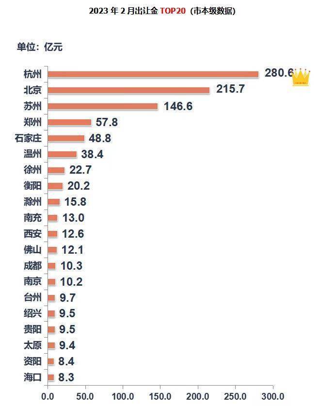 细分城市来看,今年2月份,杭州、北京、苏州的土地出让金总额位列前三名,分别为280.6亿元、215.7亿元和146.6亿元。