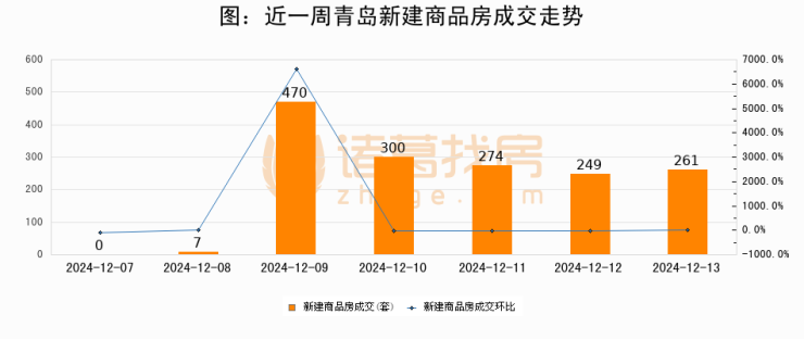 根据青岛市住房和城乡建设局数据显示,2024年12月13日青岛新建商品房成交261套,较昨日增加12套,环比上涨4.8%