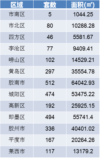 从各区成交情况来看,上周原胶南市新建商品住宅成交512套,成交面积为64042.93㎡,位列上周各片区新建商品住宅成交面积和成交套数首位;即墨区以成交493套,成交面积55741.4㎡的成绩名列第二;城阳区以单周成交474套,成交面积53475.22㎡列第二位;