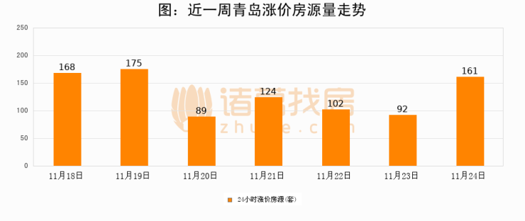根据诸葛找房数据显示,青岛24小时涨价房源量为161套,较11月23日增加69套,环比上涨75%。与此同时,涨价房源占比小幅扩大,业主信心有所提升。